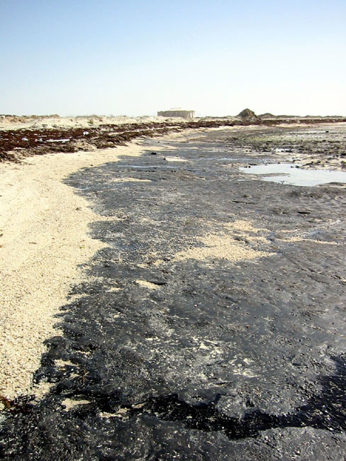 Here at Al Zubara, we are reminded of the power of that oil. For all of the wonderful things that it has brought to Qatar, we can here also see the weapon that oil can be. The expansive tidal flat is ringed by a virtual parking lot, a thick crust of tar laid down by the millions of crude released into the Gulf by Saddam a decade ago.
